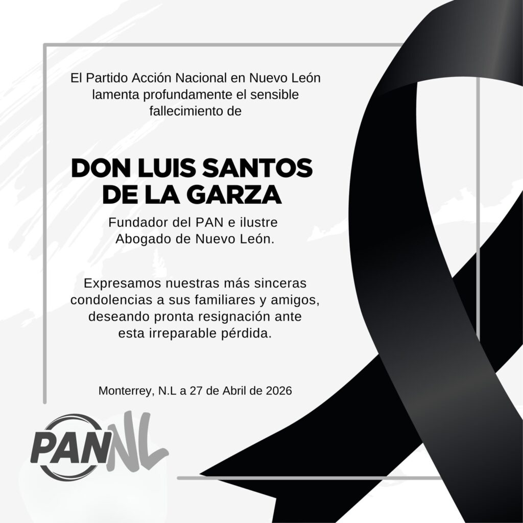 Falleció a los 104 años de edad Luis Santos de la Garza, decano panista, destacado abogado y luchador por la democracia en México y Nuevo León, afiliado a Acción Nacional desde 1941, donde fue regidor y Senador de la República.