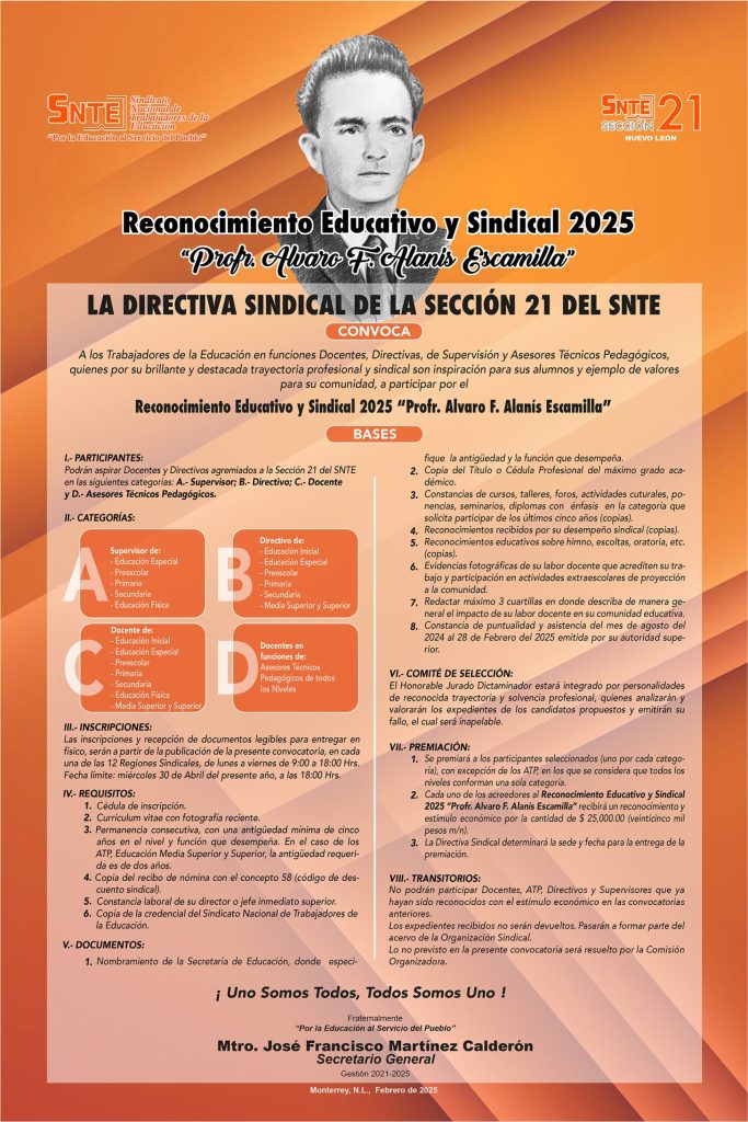 La Sección 21 del Sindicato Nacional de Trabajadores de la Educación, encabezado por el maestro José Francisco Martínez Calderón, lanzó la convocatoria al Reconocimiento Educativo y Sindical 2025, «Profr. Álvaro F. Alanís Escamilla».